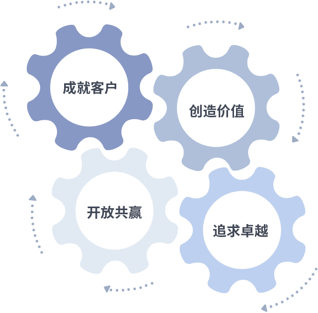 成就客户是一切决策的出发点,,,创造价值是衡量所有工作的标准,,追求卓越是我们做事做人的态度,,,,开放共赢是我们的格局也是最终的结果。。价值观的齿轮环环相扣,,,,推动着组织里的每个人不断向前。。