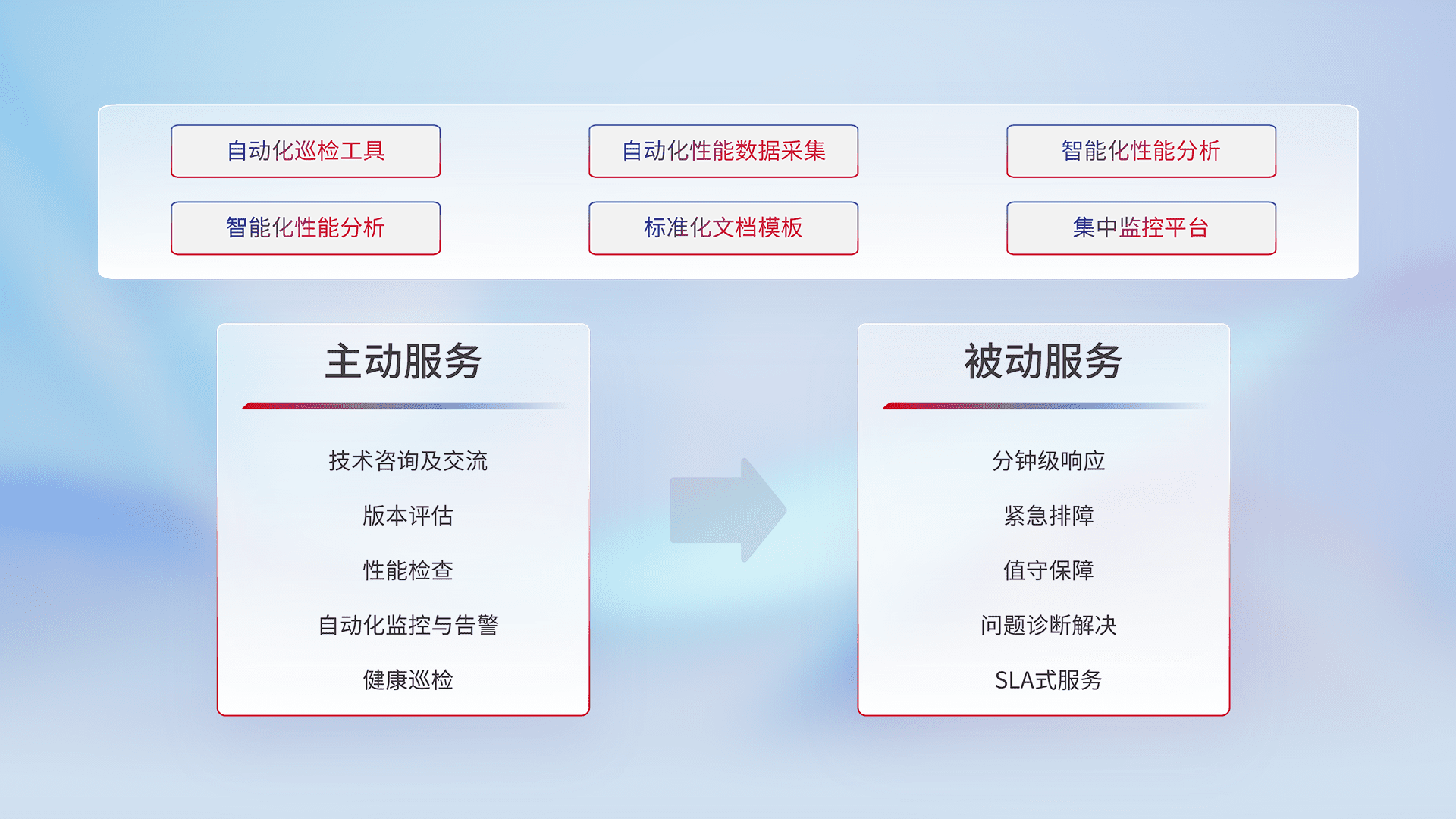 智能化工具和标准化文档,,,保障服务质量,,,,提供主动服务(包含技术咨询、、、版本评估、、、性能检查、、自动化监控与告警、、健康巡检)和被动服务包含(分钟级响应、、、、紧急排障、、值守保障、、、问题诊断解决、、、、SLA服务)。。。